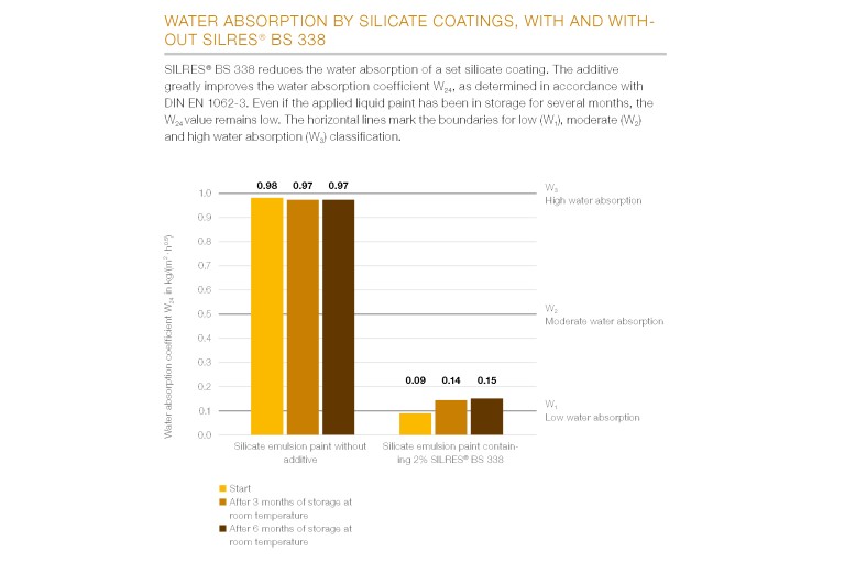 大大降低涂料的毛细吸水率,从而减弱其吸水性和透水能力,刚产出的硅酸盐涂料和已在室温下储存3个月或6个月的涂料同样如此。根据DIN EN ISO 7783标准对水汽扩散阻力进行测量表明,用SILRES® BS 338对涂料进行改性并不会降低涂层的透气性,亦即,蒸汽可继续从涂层扩散出去。