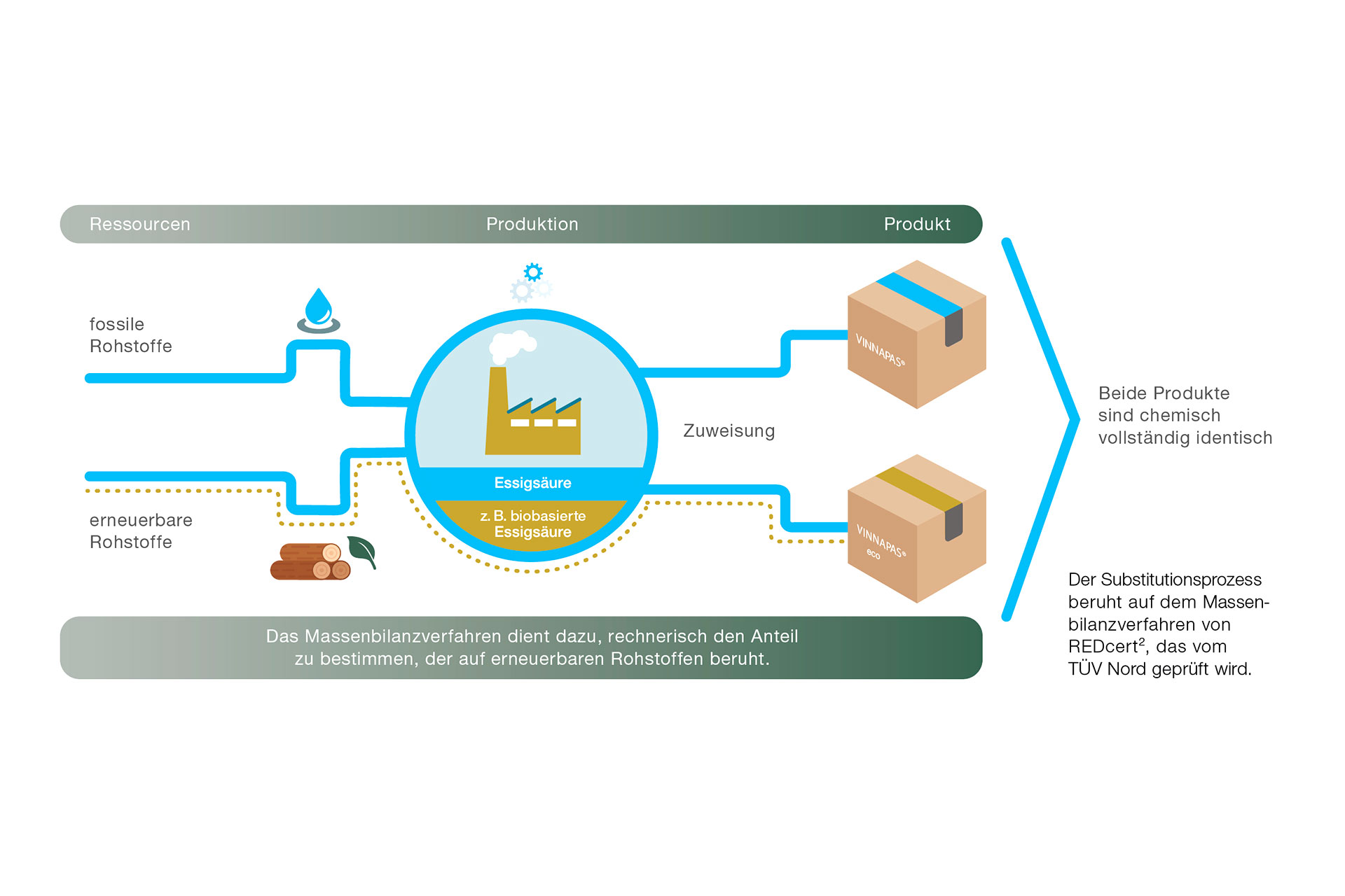 瓦克的现有生产线同时使用生物基乙酸和来自化石源的乙酸进行生产,如此制成的VAE聚合物的原子,部分源自可再生原料,部分来自石化原料。之后,瓦克根据物料衡算法,将所产VAE聚合物的量分成两个部分。用生物基乙酸生产而成的最终产品在实验室里与基于石化原料生产而成的聚合物毫无二致,区别仅在于生产链使用的原料。