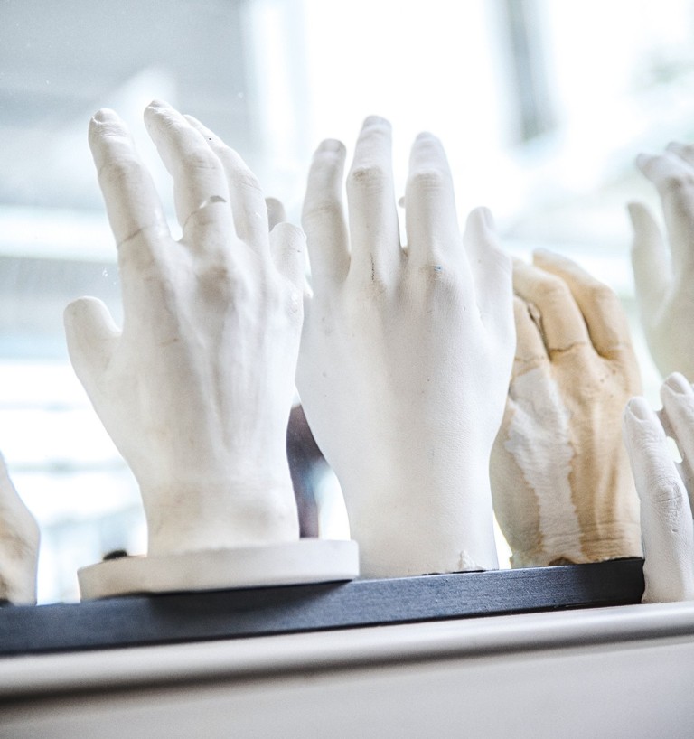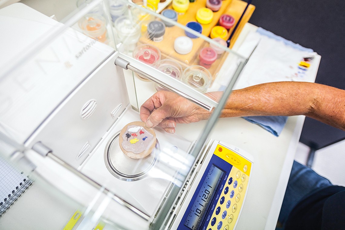 借助照片和残肢模型,奥托博克的员工——这些真正的工艺大师——尽可能精确地复制原有的肢体。有时候,所做的工作需要太多的时间,以致于有机硅化合物开始固化,难以作业。当这种情况发生时,Leiniger部门的工艺大师们穿上套头毛衣、戴上围巾,到冷库中进行修理,因为冷库17 °C 的温度可以延长材料用于加工假体的时间。当所有微细的细节——从小腿上的原有毛发、年龄特征和雀斑,到可涂漆的丙烯酸树脂指甲——被复制之后,假体在130~180℃的温度下进行固化。