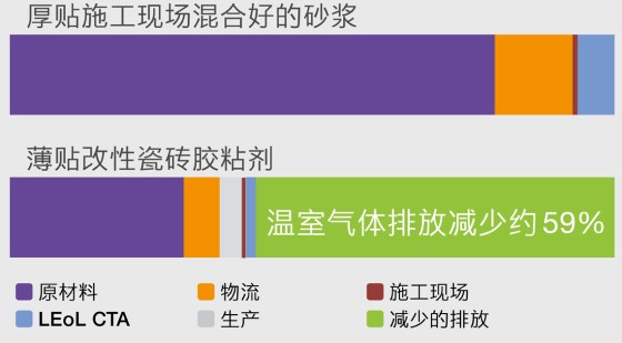 从厚层工艺转向薄层工艺,可降低整个建筑体系的碳足迹。建筑物所需要的砂浆更少,意味着运输和资源消耗量减少,特别是砂子。拆建筑除时,产生的碎片也更少。因此,相较于厚层瓷砖胶粘剂,在建筑的整个生命周期内,薄层瓷砖胶粘剂可以将温室气体排放量降低高达60%。