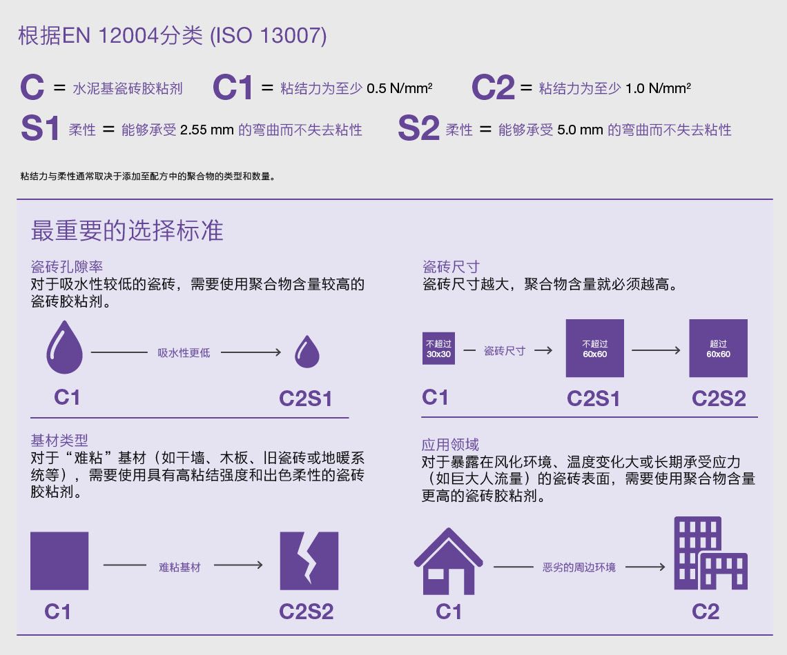 尺寸、孔隙率、基材、载荷?我们为您汇总了选择对口瓷砖胶粘剂时的注意事项,以及常见等级名称的解释——一页纸,清晰实用,一目了然,供保存、查阅和打印使用。