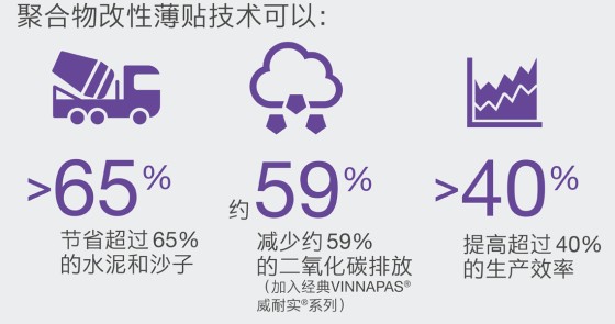 效率是实现可持续发展的一大杠杆。VINNAPAS®威耐实®可再分散乳胶粉和乳液能够改善砂浆的特性,让您能够在更短的时间内用更少的材料达到更好的效果。因此,它们是促进产生更多可持续解决方案的“使能者”。同时,我们还致力于减少VINNAPAS®威耐实®本身对环境的影响。我们不断降低生产过程中的单位能耗,并通过物料衡算法,用可再生原材料打造VINNAPAS®威耐实® eco系列产品。我们清楚,这仅仅是一个开始。我们诚邀您加入这一行列,与我们一起向前迈进。让我们齐心协力,推动建筑行业的可循环性,真正建设一个更加美好的世界!