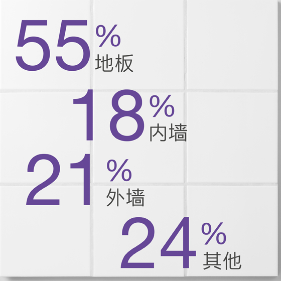 对于大尺寸瓷砖而言,基材的平整度至关重要,否则可能会出现空洞,导致瓷砖在压力下开裂。但这只是部分因素。如今,瓷砖不仅仅用在浴室和厨房,外墙、露台、公共区域、游泳池等位置都随处可见瓷砖的身影。根据2019年数据,全球50%以上的地板均采用陶瓷砖铺设。