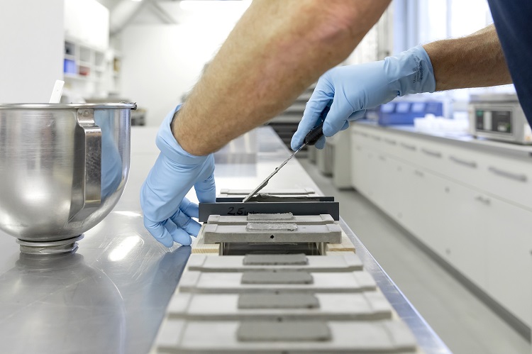 瓦克实验员将颜料添加到可再分散乳胶粉中。
